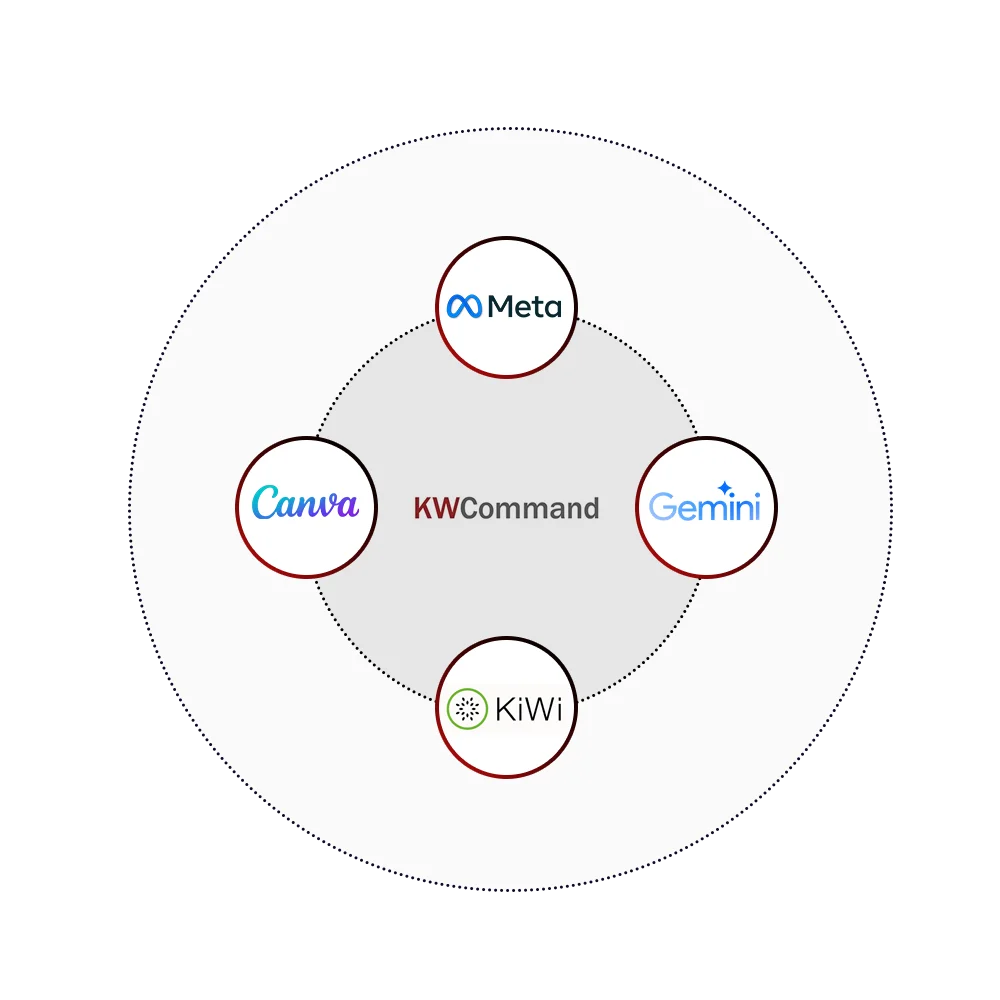 - KW Command: nuestra plataforma central. Te permite gestionar tu base de datos, campañas de marketing, tareas, propiedades y reportes en un solo lugar.